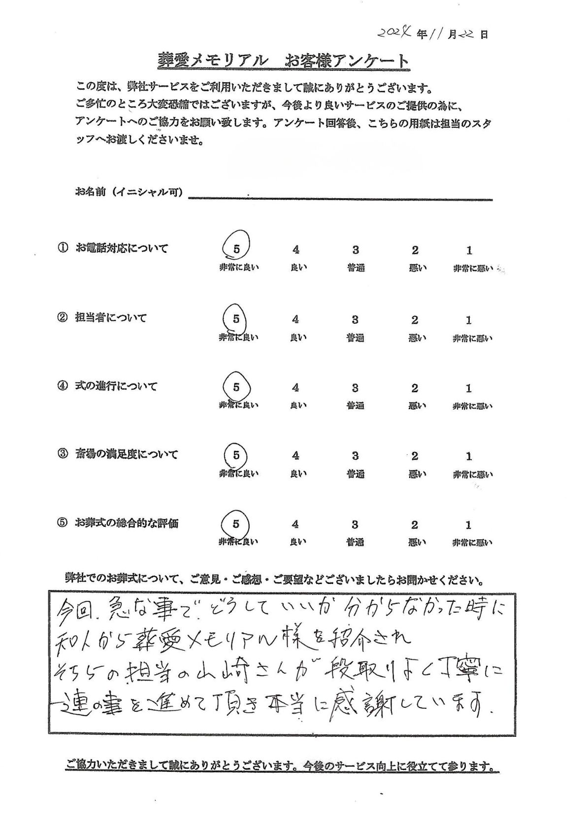 今回、急な事でどうしていいか分からなかった時に知人から葬愛メモリアル様を紹介され、そちらの担当の山崎さんが段取りよく丁寧に一連の事を進めて頂き本当に感謝しています。